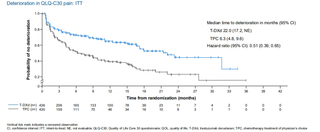 王树森教授:DESTINYBreast-06研究中T-DXd较TPC显著提升mPFS,为13.2个月vs 8.1个月。该研究TPC组中约60%的患者选择的口服卡培他滨方案,其特点为安全性好,对生活质量影响较小。在该研究的疗效数据公布时,我们对T-DXd带来的生活质量改变更为期待。因此,胡夕春教授在此次ESMO大会中报道的DESTINYBreast-06研究患者报告的结局(PRO)更加令人关注。最终公布的PRO也未令人失望,T-DXd相较于对照组并未影响患者生活质量,有效推迟了患者症状恶化时间,为患者带来了更好的治疗保障;例如T-DXd组疼痛TTD显著延迟,恶化风险降低了49%(22.0个月vs 6.3个月;HR=0.51,95%CI 0.39-0.65);在其他关注的PRO指标方面,T-DXd组相较TPC组还可降低身体机能、疲劳的恶化风险。