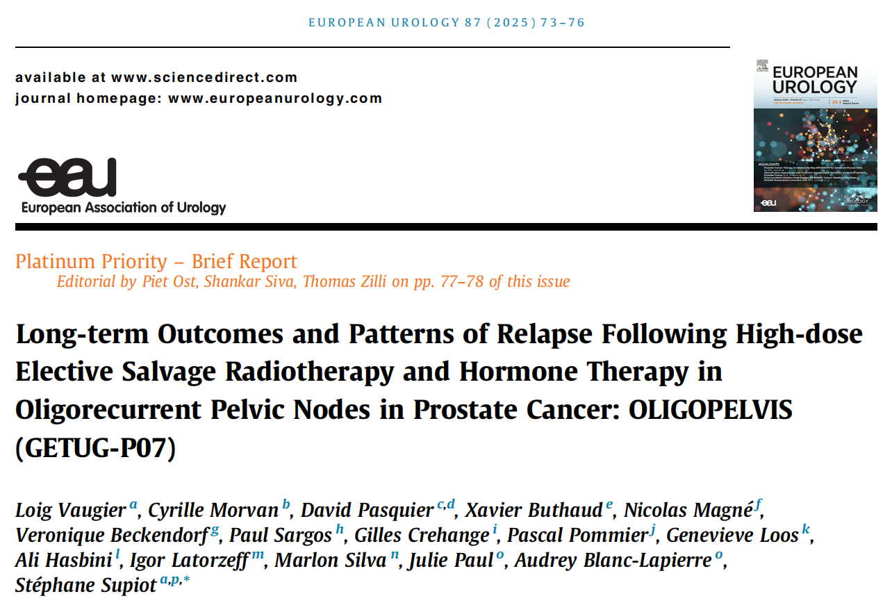 Vaugier L,Morvan C,Pasquier D,et al.Long-term outcomes and patterns of relapse following high-dose elective salvage radiotherapy and hormone therapy in oligorecurrent pelvic nodes in prostate cancer:Oligopelvis(GETUG-P07)[J].European Urology,2025,87(1):73-76.