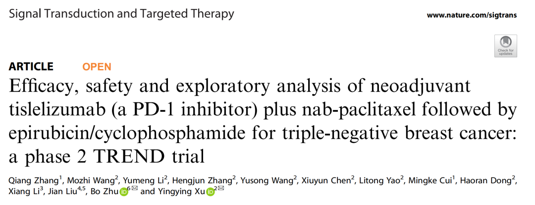 编者按:2025年5月26日,中国医科大学附属第一医院徐莹莹教授、辽宁省肿瘤医院张强教授、陆军军医大学第二附属医院朱波教授联合团队在Nature旗下的Signal Transduction and Targeted Therapy(STTT)发表2期TREND研究成果。该研究首次证实替雷利珠单抗联合无铂、低剂量的白蛋白紫杉醇序贯表柔比星/环磷酰胺(NabP-EC)方案用于三阴性乳腺癌(TNBC)新辅助治疗,具有良好的疗效反应和可控的安全性,为规避铂类毒性同时保持疗效提供全新策略。与此同时,该研究还进行了多组学的生物标志物探索性分析,可为TNBC新辅助免疫治疗的精准筛选提供参考。