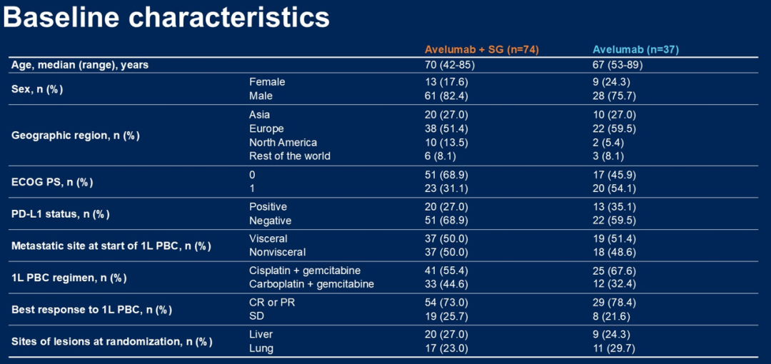 本次结果披露中,74例阿维鲁单抗+SG组中有38例(51.4%)仍接受治疗;37例阿维鲁单抗单药组中有10例(27.0%)仍接受治疗。两组中患者中位年龄分别为70岁和67岁,脏器转移比例分别为50.0%和51.4%,ECOG评分为1的比例阿维鲁单抗+SG组较低(31.1%vs 54.1%)。