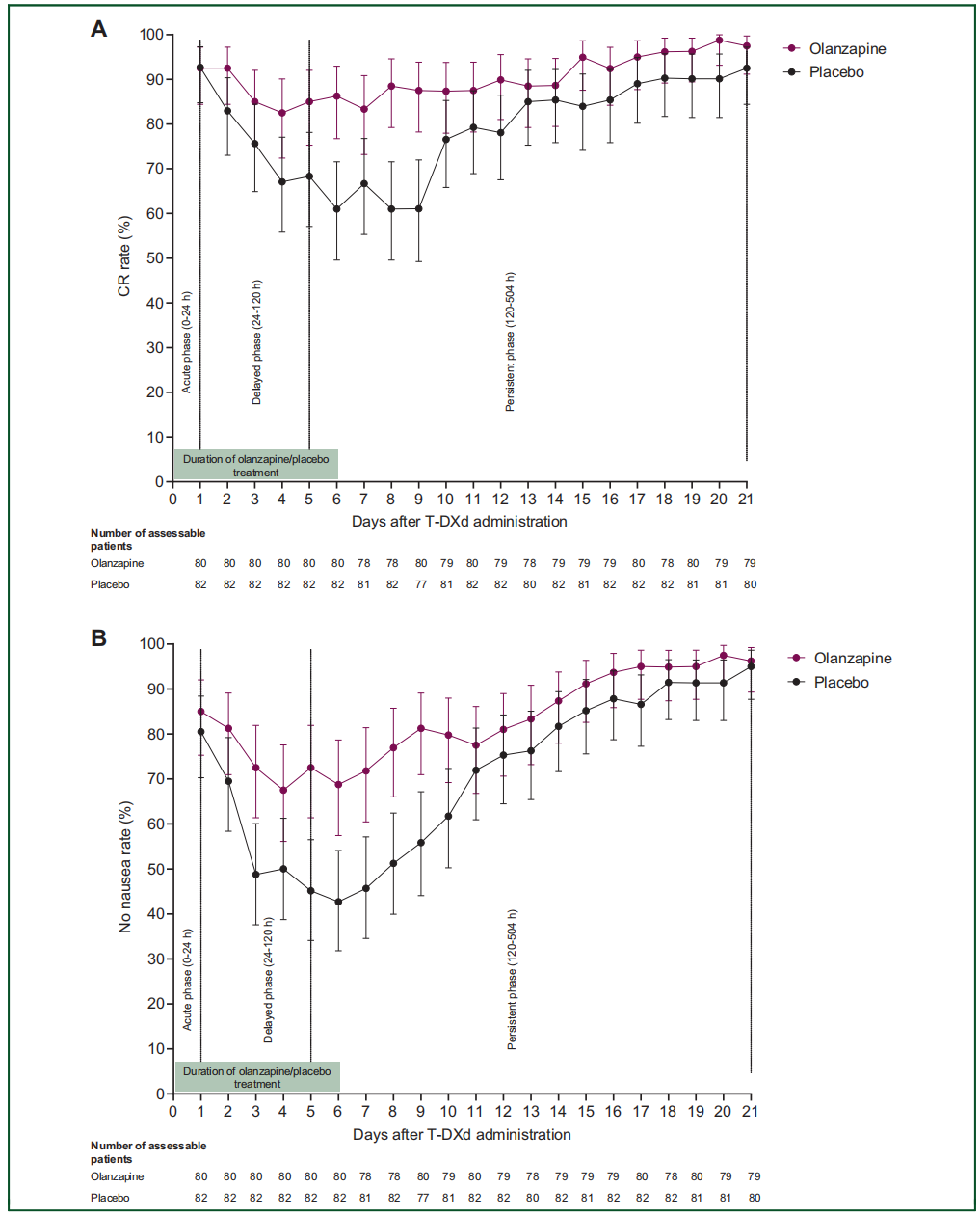 ERICA研究是一项多中心、随机、双盲、安慰剂对照的Ⅱ期试验,旨在评估奥氮平在预防T-DXd治疗引起的延迟性和持续性恶心和呕吐方面的疗效和安全性。患者被随机分配到奥氮平5mg或安慰剂组,每天一次,从第1天到第6天,同时接受5-羟色胺3型受体拮抗剂和地塞米松。研究人员定义了3个恶心和呕吐的发生时期: