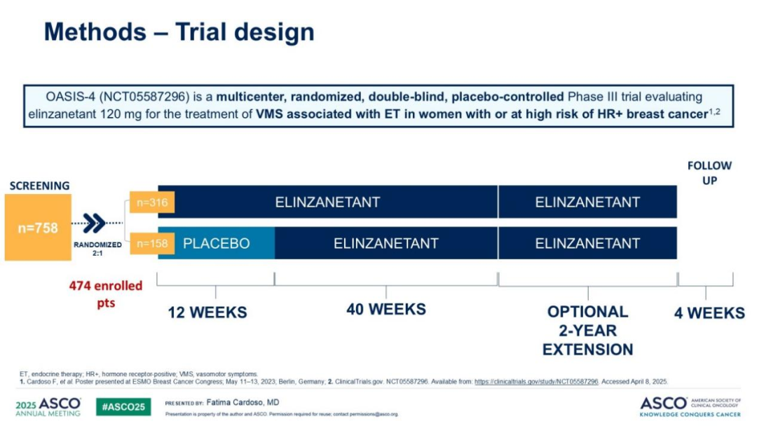OASIS-4研究是一项随机、双盲、安慰剂对照的III期临床试验研究。2022年10月-2024年11月入组了全球90家中心的474例接受内分泌治疗且出现中重度血管舒缩症状(VMS)的HR阳性早期乳腺癌患者或者内分泌预防的高危人群(实际仅入组1例),(VMS轻度:感觉到潮热、无汗;中度:感觉到潮热、有汗;重度:感觉到潮热、有汗、影响活动)。晚期或者复发转移的患者、入组前3月内计划手术的患者、研究期间计划手术、放疗、化疗、免疫治疗的患者不能入组。