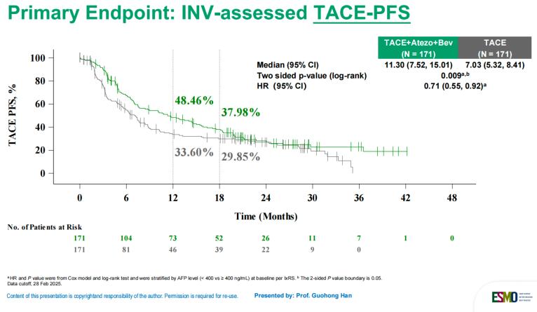 2025年7月3日,在2025年欧洲肿瘤内科学会胃肠道癌症大会(ESMO GI 2025)上,III期临床研究TALENTACE作为突破性进展(Late-Breaking Abstract,LBA2) 公布关键结果,受到全球肿瘤学界高度关注。该研究评估了阿替利珠单抗+贝伐珠单抗(简称:T+A)联合按需经动脉化疗栓塞术(TACE)在未接受过全身系统治疗的不可切除肝细胞癌患者中的疗效和安全性。研究结果显示,主要终点TACE无进展生存期(TACE-PFS)取得了统计学和临床意义上的显著改善,中期分析时总生存期(OS)尚不成熟。同时,由RECIST v1.1标准评估的无进展生存期(PFS)也观察到了有临床意义的改善。这一突破性研究为肝癌治疗领域带来了新的希望,标志着局部肿瘤控制与系统分子干预的联合治疗模式取得重大进展。