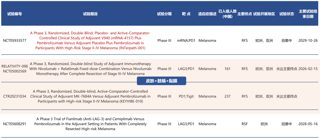 上述KEYNOTE054、CheckMate238、KEYNOTE716、CheckMate76K研究均为欧美国家主导的全球多中心研究,纳入患者以皮肤型黑色素瘤为主,单免疫仍是当前辅助免疫治疗标准,但免疫联合治疗的获益仍有待观察。