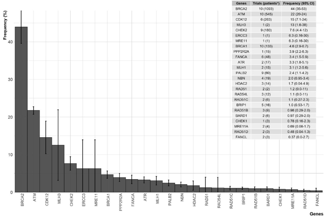 HRR基因突变频率在纳入试验中差异显著(图2):BRCA2突变占42%(1093例),ATM占5%(545例),CDK12占7%(263例),PALB2占6%(180例)。疗效异质性与基因功能相关:BRCA2/PALB2作为HRR核心修复基因,突变后对PARPi敏感性更高;ATM作为DNA损伤传感器,突变后未显著影响PARP依赖。