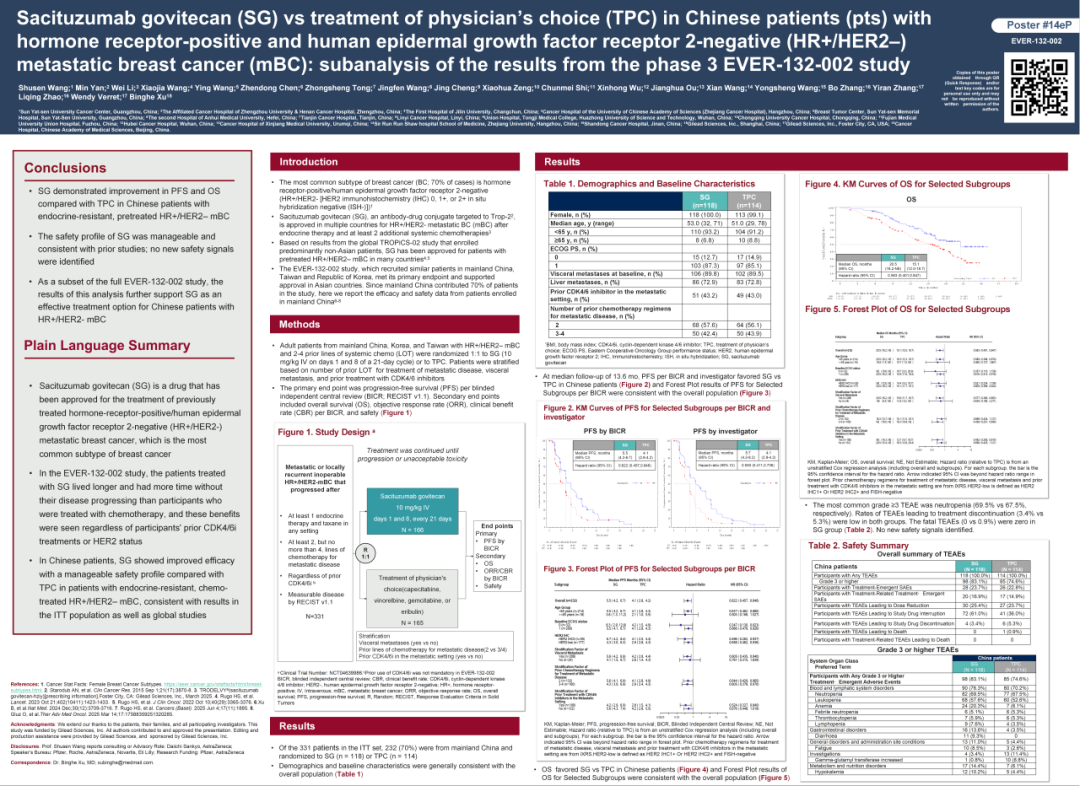 [5]Shusen Wang,Min Yan,et al.Sacituzumab govitecan(SG)vs treatment of physician’s choice(TPC)in Chinese patients(pts)with hormone receptor-positive and human epidermal growth factor receptor 2-negative(HR+/HER2–)metastatic breast cancer(mBC):subanalysis of the results from the phase 3 EVER-132-002 study.2025 ESMO TAT Asia Poster#14eP.