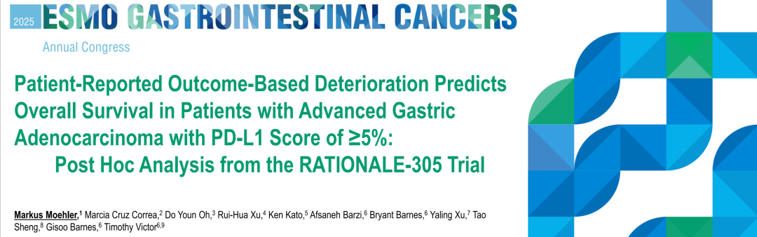 参考文献:MOEHLER M,CRUZ-CORREA M,OH D Y,et al.392MO recurrent patient-reported outcome(PRO)-based deterioration predicts overall survival(OS)in patients with advanced gastric adenocarcinoma with PD-L1 score of≥5%:results from the RATIONALE-305 trial[J].Annals of Oncology,2025,36:S153.