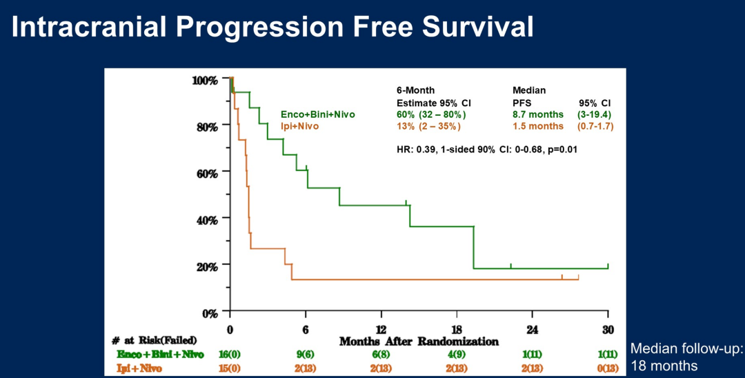 Checkmate 204研究提示黑色素瘤脑转移患者NIVO+IPI联合方案可明显获益,但在有症状转移患者中效果欠佳,这可能与有症状脑转移患者应用糖皮质激素有关[7]。而对于BRAF突变的脑转移患者,无论有无症状,双靶治疗在颅内和颅外都能达到相似的ORR(60.8%vs 59.1%)[8,9]。因而,双靶联合免疫有可能可以进一步提升BRAF突变脑转移患者的有效率。II期随机试验SWOG S2000对比了双靶联合免疫(BRAF抑制剂Encorafenib+MEK抑制剂Binimetinib+nivolumab)与NIVO+IPI在BRAF突变脑转移患者中的疗效。结果显示,双靶联合免疫组在PFS(6.2个月vs 1.5个月)和颅内ORR(75%vs 13%)方面显著优于双免疫组,但两组中位OS无显著差异(8.7个月vs 13.8个月,P=0.66)。
