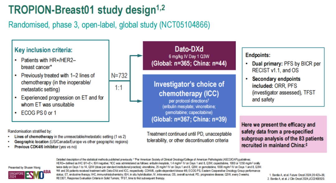 [2]Qingyuan Zhang,Shunsen Wang,Zefei Jiang,et al.Datopotamab deruxtecan(Dato-DXd)vs chemotherapy(CT)in patients(pts)with pre-treated inoperable/metastatic hormone receptor-positive,HER2-negative(HR+/HER2–)breast cancer(BC):Results from TROPION-Breast01 China cohort[EB/OL].ESMO Asia 2024.Abstract 38MO.