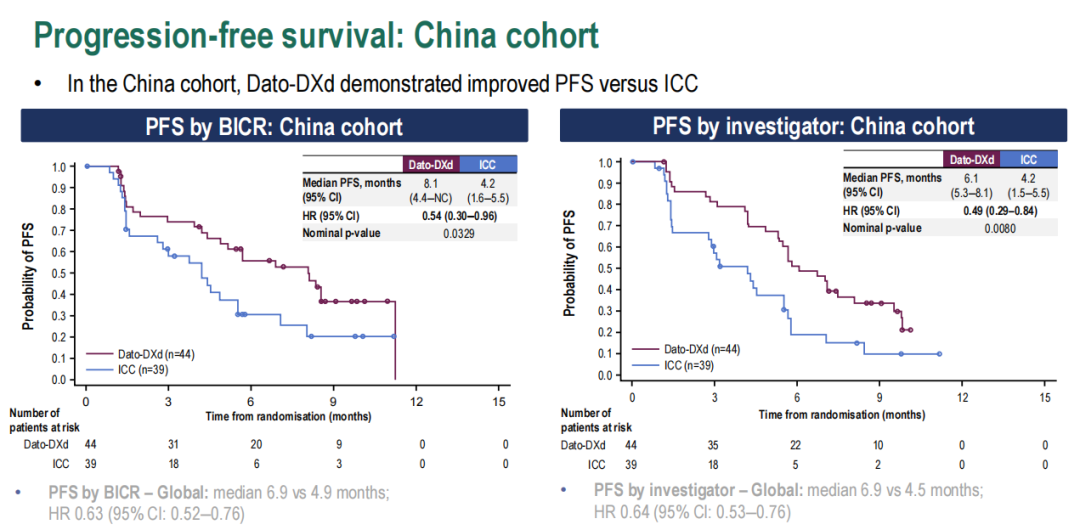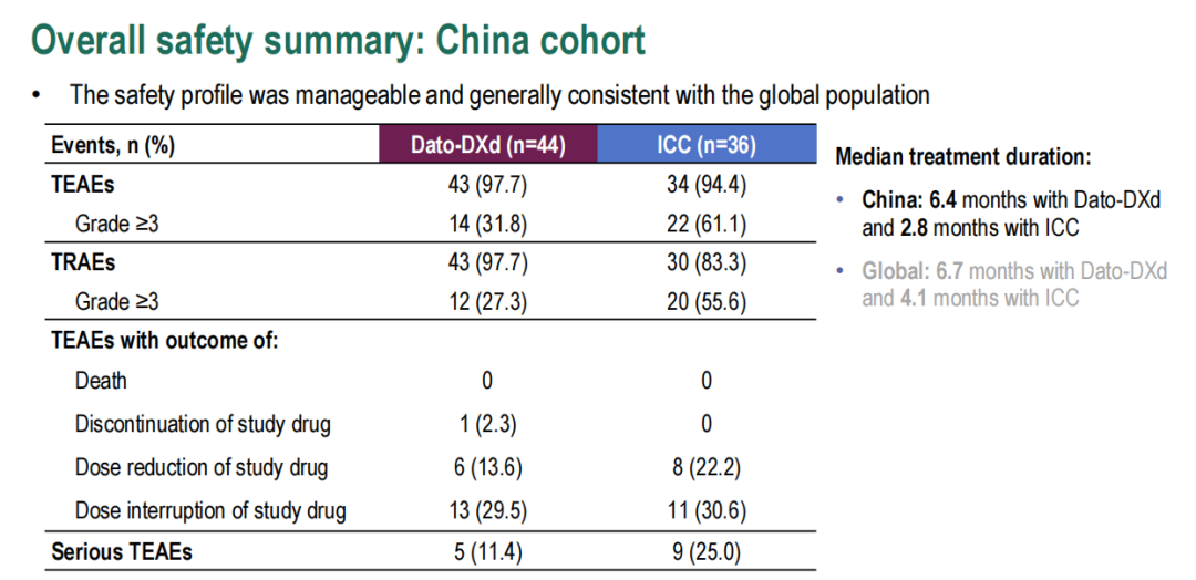 此外,Dato-DXd为中国患者了带来更高缓解率(ORR方面两组分别为38.6%vs17.9%),显著延长至首次后续治疗时间[2]。由此可见,中国人群能够在Dato-DXd的治疗中有更多获益。