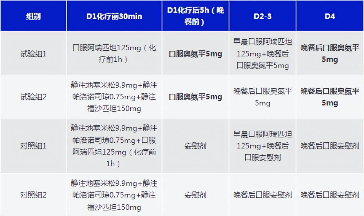 6月17日,《Lancet Oncology》在线发表了奥氮平5mg联合三联止吐方案用于含蒽环类方案治疗乳腺癌的疗效及安全性的III期临床研究[4]。该研究创新设计了四联止吐方案,其创新点在于改进了奥氮平使用方法,于D1化疗后5h——即患者居家晚餐前,试验组口服奥氮平5mg、对照组予以安慰剂;D2-4晚餐后试验组继续口服奥氮平5mg、对照组予以安慰剂(表1)。