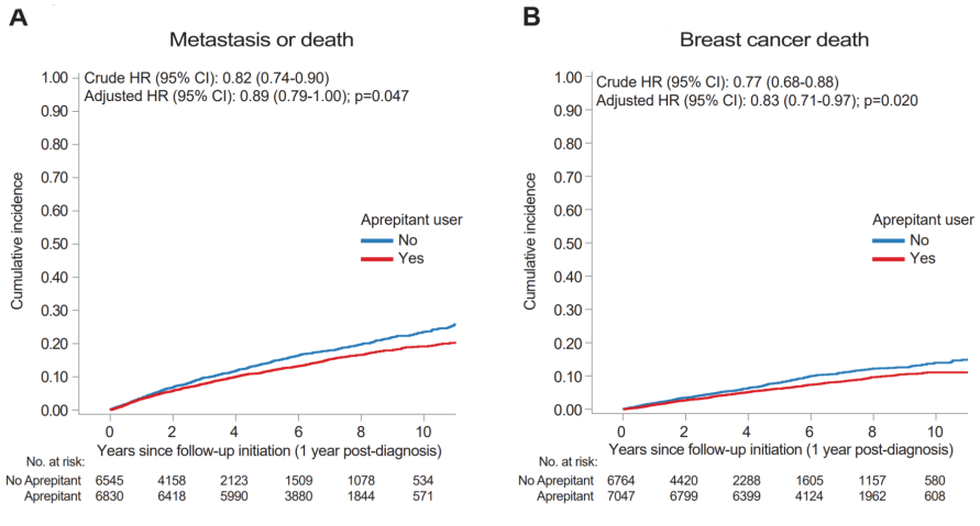 图1.阿瑞匹坦止吐组乳腺癌进展及死亡风险更低
