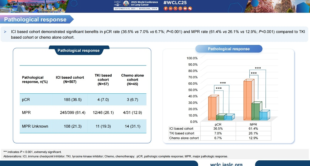 钟华教授:Peri-R队列纳入病理诊断为1~3期且新辅助治疗后接受手术切除的非小细胞肺癌患者,患者新辅助治疗类型不受限制。研究主要终点为p-CR,次要研究终点包括安MPR、EFS及OS等。研究共纳入609例患者,其中,接受免疫检查点抑制剂为基础的围术期治疗、接受TKI为基础的围术期治疗、单纯接受化疗的患者分别有507例、57例和45例。