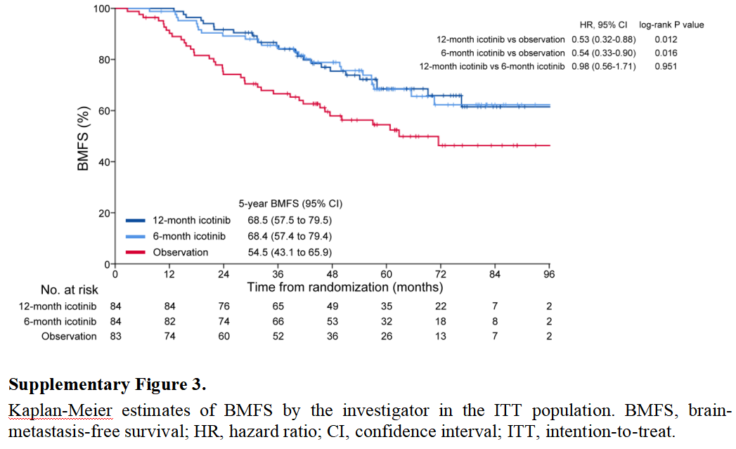 3)脑转移防控优异:埃克替尼显著延长无脑转移生存期(BMFS),5年BMFS率超68%,降低脑复发风险。