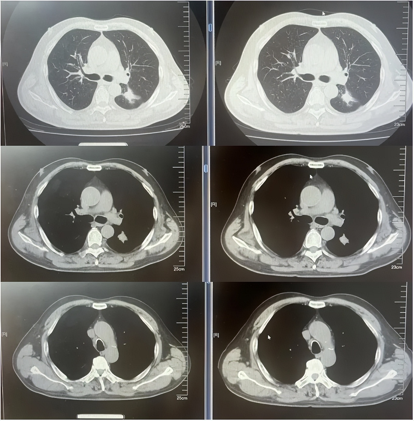 病例1:患者男,68岁。2024年6月以“胸闷气短1个月”为主诉于当地医院检查治疗。查CT提示左肺下叶肿物,纵隔、双肺门多发肿大淋巴结,左侧胸腔积液,左侧胸膜增厚。于当地医院行胸水穿刺引流查癌细胞提示肺腺癌。临床分期:cT2aN3M1a IVA期。患者于当地医院行血液基因检测未见敏感突变,使用AP方案化疗后病情进展。2025-1入我院后行肺穿刺活检,病例提示腺癌。行基因检测提示:ERBB2突变(丰度3.5%)。行德曲妥珠单抗(T-DXd)治疗至今。最佳疗效PR,目前持续有效中,PFS已超过7个月。患者使用德曲妥珠单抗期间出现II级恶心呕吐,经对症治疗可缓解。