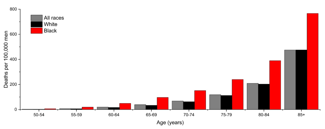 黑人男性的死亡率(每10万人36.9例死亡)几乎是其他任何种族或民族群体的两倍,并且在各个年龄段均高于白人男性,死亡率比在85岁及以上男性中为1.61,在40-44岁男性中高达3.33。除了较高的发病率之外,可能导致黑人男性死亡率更高的因素还包括疾病更具侵袭性的倾向、糖尿病和/或高血压等合并症患病率较高、较少接受符合指南的护理和根治性治疗,以及较少有机会进入高手术量中心。研究表明,患有相同分期和分级的前列腺癌的黑人男性和白人男性,如果接受同等治疗,其结局是相同的。一项当代荟萃分析发现,在考虑了健康的社会决定因素后,黑人男性的前列腺癌特异性死亡率比白人男性低14%。