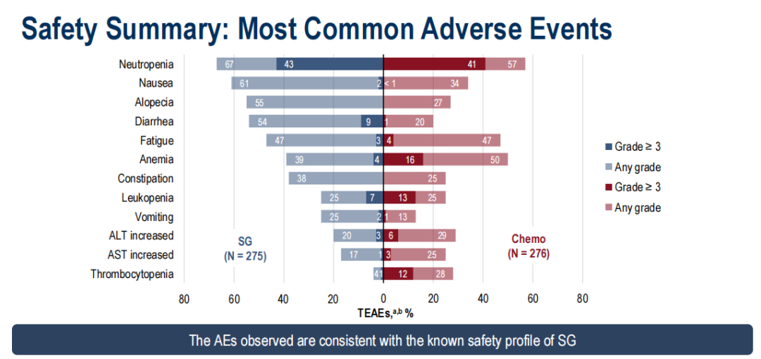 安全性方面,在中位暴露时间长于化疗组(SG、紫杉类、GC:8.3 vs 6.3 vs 5.8个月)的情况下,SG组≥3级治疗期间不良事件(TEAEs)与化疗组相当(66%vs 62%),但停药率仅为化疗组的三分之一(4%vs 12%),导致减量的不良事件发生率也低于化疗组(37%vs 45%)。SG组的常见≥3级不良事件为:中性粒细胞减少(43%vs 41%)、腹泻(9%vs 1%)等,临床易于管理。治疗过程中患者也并未出现新发不良事件。