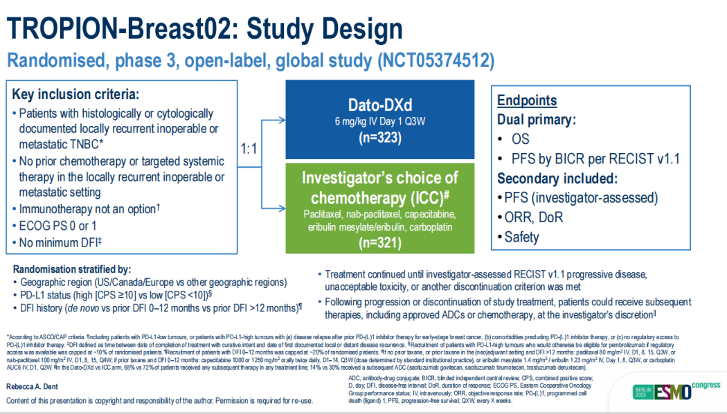 TROPION-Breast02的双主要终点为根据BICR评估的无进展生存期(PFS)及总生存期(OS)。关键次要终点包括研究者评估的PFS、客观缓解率(ORR)、缓解持续时间(DoR)、疾病控制率(DCR)、药代动力学(PK)及安全性。