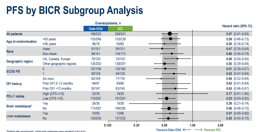 亚组分析显示,无论患者年龄、地区、PD-L1状态、DFI时间、既往是否有脑和肝转移,接受Dato-DXd治疗的患者均有一致的PFS和OS获益。