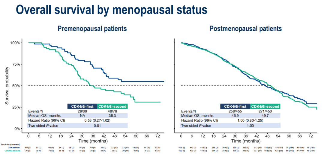 一项事后亚组分析提示,一线使用CDK4/6i可能为绝经前患者带来OS获益,但在绝经后患者中未观察到类似获益。