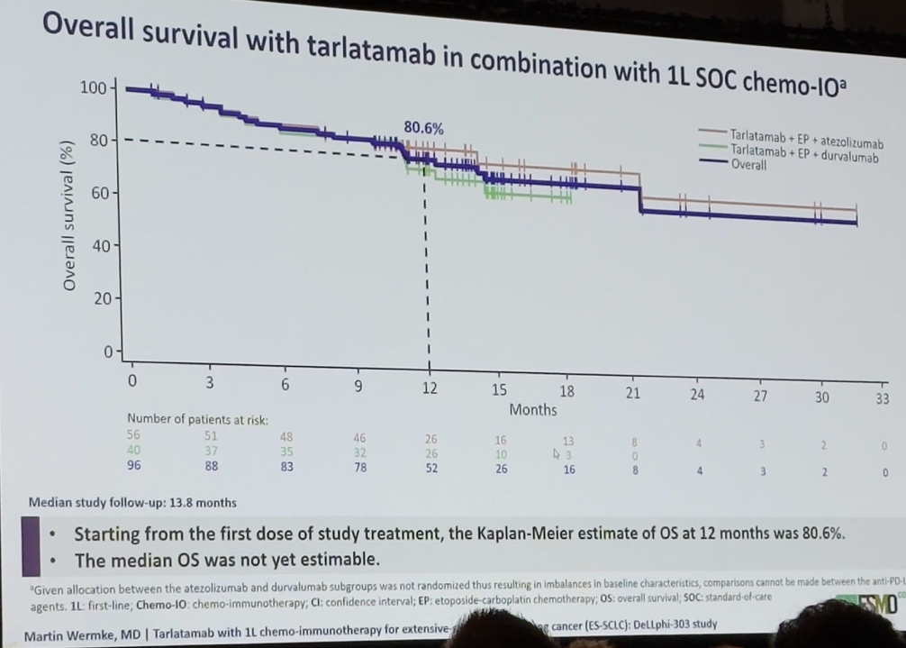 研究共纳入受试者96名,其中56名接受Tarlatamab+EP+阿替利珠单抗,40名接受Tarlatamab+EP+度伐利尤单抗。入组受试者中位年龄为63岁,67%为男性,16%存在经治、无症状脑转移,45%存在肝转移。研究中位随访时间为13.8月。