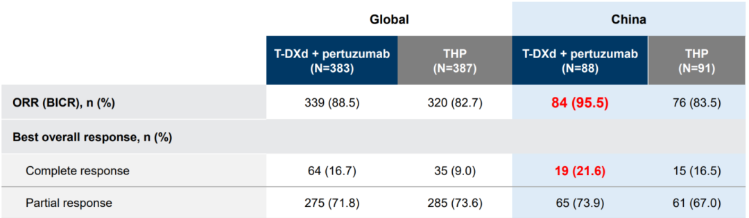 首先,在未来的HER2阳性乳腺癌初始一线治疗方面,有了如此强大的治疗方案,将使很多患者第一时间获得缓解。该研究中T-DXd+P方案的全球人群总体客观缓解率(ORR)为88.5%多,中国人群ORR高达95.5%,意味着未来对于此类患者使用该方案时,我们有信心在初始治疗时对患者说有九成把握使肿瘤退缩。同时,中国人群完全缓解率(CR)能达到21.6%,即有1/5的患者经过治疗以后可以使病灶完全消失[1,2]。
