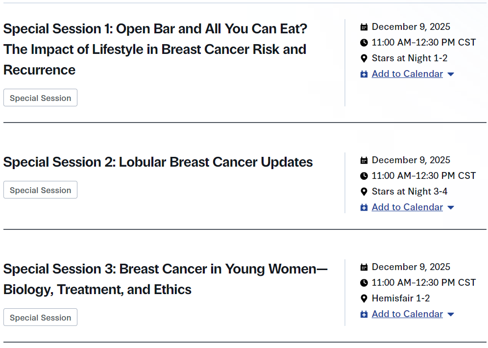 编者按:第48届圣安东尼奥乳腺癌研讨会(SABCS 2025)将于当地时间2025年12月9-12日在美国得克萨斯州圣安东尼奥Henry B.Gonzalez Convention Center举行。作为乳腺癌领域的顶级盛会,SABCS聚焦乳腺癌生物学、病因、预防、诊断及治疗前沿,促进临床、转化与基础研究的深度融合,为全球科研人员提供交流协作与专业成长的平台。肿瘤瞭望-乳腺时讯特整理会议首日(12月9日)精彩内容,涵盖职业发展论坛、特别会议、研讨会、教育专场、颁奖讲座及Mini口头报告等,并将Mini口头报告(Rapid Fire 1和Rapid Fire 2)题目进行整理,以便读者快速了解会议动态,敬请关注后续详细报道!