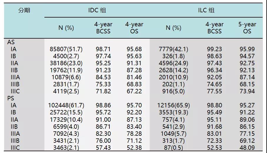 研究结果:研究共纳入了184,541例女性患者,其中90%为IDC,10%为ILC。两组人群的分期分布及不同分期的4年乳腺癌特异生存和4年总生存如表1所示。研究结果提示,在不同病理类型中AS和PS均能对患者进行较好的分层。