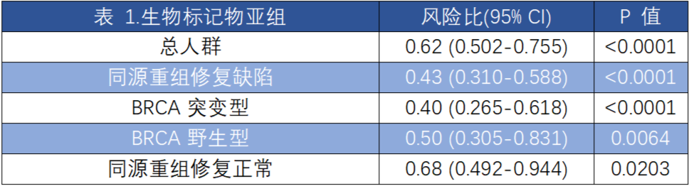 结果:733名随机患者(尼拉帕利:487;安慰剂组:246)中,373名(51%)携带同源重组修复缺陷(尼拉帕利:247;安慰剂组:126),249名(34%)同源重组修复功能正常(尼拉帕利:169;安慰剂组:80)。35%的患者为IV期,67%的患者接受了新辅助化疗,31%的患者在一线化疗后达到PR。在所有的生物标志物亚组中,尼拉帕利治疗组患者的PFS有显著的统计学获益和临床获益(表1)。最常见的≥3级不良事件为贫血(31%)、血小板减少症(29%)和中性粒细胞减少症(13%)。