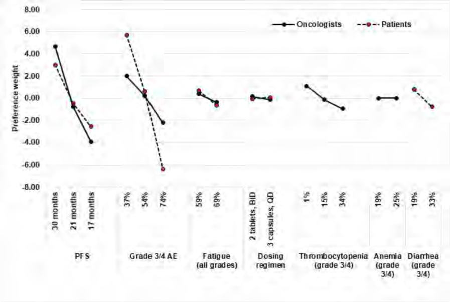 结果:中期统计时共纳入128名患者,平均年龄为55岁;32%的患者完成初始治疗,68%的患者处于二线及以上治疗。共纳入151名肿瘤科医生,平均执业时间15年:54%个人执业,17%就业于综合护理中心,29%就业于医院。在假定的治疗方案中,肿瘤科医生认为PFS从17个月提升至30个月是最重要的,也接受PFS增加6.3个月但3-4级不良事件风险从37%增加至74%的结果。但患者最看重的是3-4级不良事件风险从74%降低到37%,且在3-4级不良事件风险降低17%的前提下,患者可接受PFS从30个月降至17个月。对于肿瘤科医生和患者来说,接受10%的疲乏不良反应风险增幅需要分别使预期PFS延长1.1个月和3.1个月。最不重要的治疗属性是3-4级贫血发生率(肿瘤科医生)和用法用量(患者)。详见图1