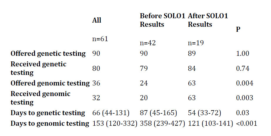 结果:在符合标准的61名女性中,69%的患者在SOLO1之前被诊断为晚期EOC,31%的患者在SOLO1之后被诊断为晚期EOC。虽然接受基因检测患者的百分比在SOLO1前后没有变化(P≥均为0.74),但SOLO1后提供和接受基因组检测的患者明显多于SOLO1前(均P<0.004)。从诊断到接受基因检测的中位时间从SOLO1前的87天(45-165天)显著下降到SOLO1后的54天(33-72天), (P=0.03)。同样,从诊断到接受基因组检测的中位时间从SOLO1前的358天(239-427天)显著减少到SOLO1后的121天(103-141天),(P<0.001)。