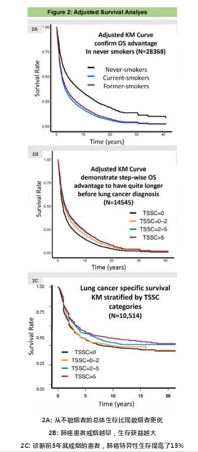研究人员观察到,从不吸烟者的总体生存(OS)比现吸烟者更优,这一发现与以前的研究一致。但是,对于吸烟人群来说,任何时候戒烟,即使是在肺癌确诊前两年戒烟,在确诊后存活的几率也会增加。