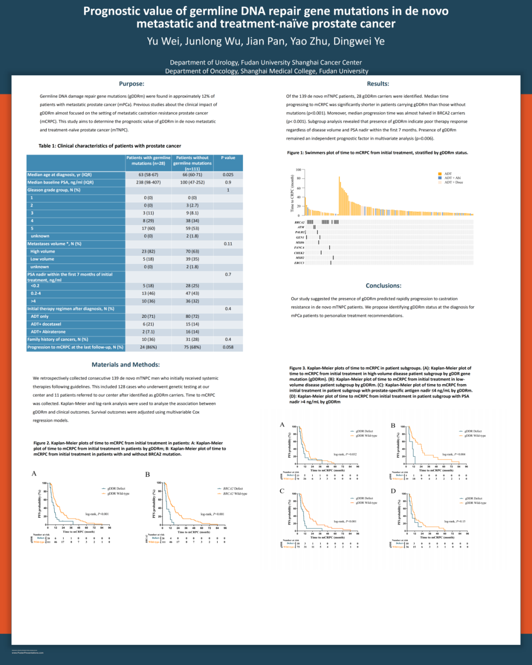研究结论:有DNA修复缺陷的mTNPC患者表现出快速发展为去势抵抗,我们建议在诊断mTNPC患者时确认gDDRm状态。此外,gDDRm是多聚ADP核糖聚合酶(PARP)抑制剂的治疗靶点。我们的结果需要在gDDRm携带者中进行更多的前线靶向治疗试验,以延长进展时间。