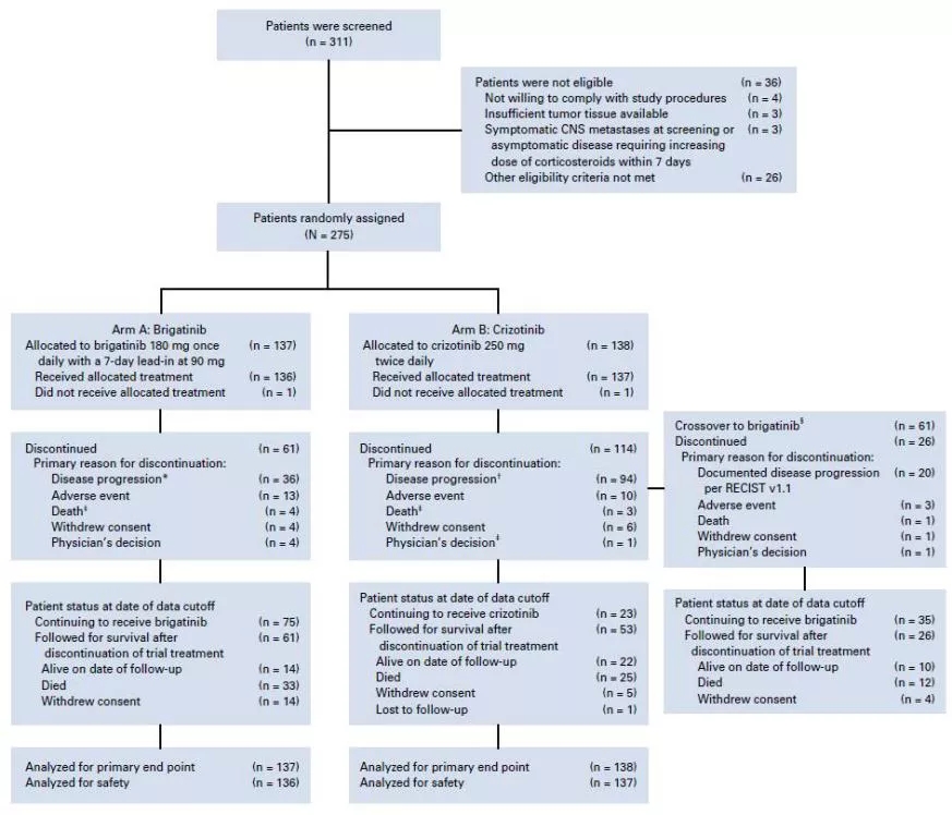 TKI治疗应当持续进行,直至疾病进展、出现不可耐受毒性反应或患者撤销知情同意。接受克唑替尼治疗的患者,疾病进展后允许交叉至布格替尼组治疗。在前14个周期,每8周进行一次疗效评估,随后每12周进行一次疗效评估,评价为客观缓解的患者,需在4周以后进行进一步确认疗效。本研究主要终点为独立评审委员会评估的PFS(无进展生存),次要研究重点为独立评审委员会评估的ORR(客观缓解率)、颅内ORR、颅内PFS及OS(总生存)、DoR(反应持续时间)等。由于该研究设置多重性比较,第一次和第二次的显著性水准分别为0.0031和0.0183。