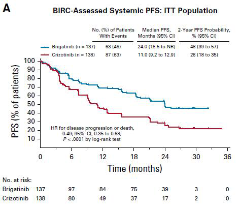 数据分析时(即2019年7月28日),布格替尼组和克唑替尼组分别有55%和17%的患者仍然接受治疗。中位随访时间分别为24.9个月和15.2个月,中位治疗持续时间分别为24.8个月和8.4个月。