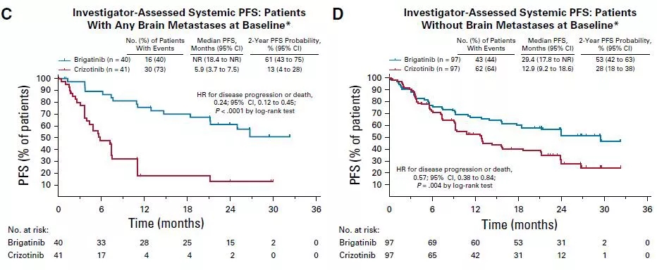 布格替尼组和克唑替尼组分别有18例和23例患者基线脑转移病灶为可评估病灶,其颅内ORR分别为78%和26%。独立评审委员会评估的两年PFS率分别为48%和15%。