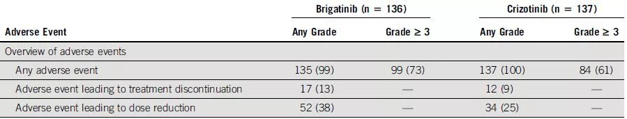 布格替尼组和克唑替尼组分别有99%和100%的患者出现任何级别的不良反应,其中3度及以上不良反应发生率分别为73%和61%。布格替尼组和克唑替尼组分别有9例和11例患者因不良反应在开始治疗的30天内死亡,但均考虑与治疗无关。两组3度及以上间质性肺炎发生率分别为3%和小于1%。