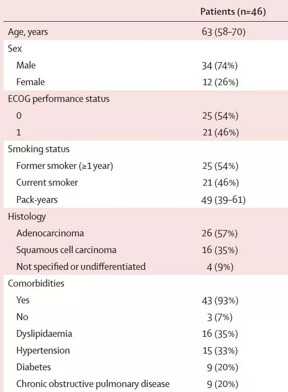从2017年4月至2018年8月,共计51例患者符合入组标准,46例患者入组,所有患者均接受至少1周期的新辅助治疗,组成修订的ITT人群,89%的患者接受手术,所有的患者均为R0切除,没有手术相关的死亡出现。41例接受手术的患者,90%的患者至少接受了1周期的Nivolumab术后辅助治疗,因此纳入符合方案集。ITT人群的中位年龄为63周岁,54%的患者PS评分为1分,57%的患者为腺癌,35%为鳞癌(图1)。