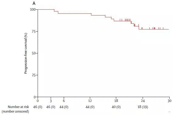 在修正的ITT人群中,12个月PFS率为95.7%,18个月PFS率为87%,24个月的PFS率为77.1%,符合方案集人群中,12个月、18个月和24个月的PFS率分别为100%、91.9%和87.9%(图2)。