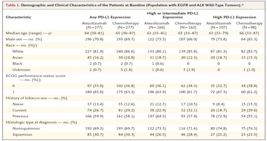 从2015年7月至2018年2月,来自19个国家、144个研究中心的572例患者接受随机化,其中,Atezolizumab组和化疗组分别有285例和287例患者。将驱动基因突变的患者排除后,两组均有277例患者,其中18例携带EGFR突变或ALK融合的患者被排除疗效分析组,但纳入安全性分析组。
