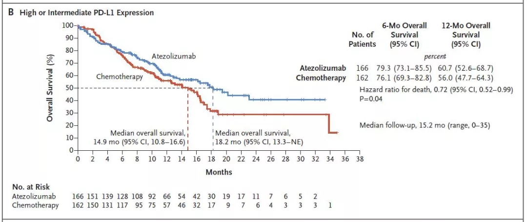 符合入组标准的患者按照1:1的比例,随机分为Atezolizumab(1200 mg,静滴)或铂类药物为基础的4~6周期化疗,治疗每三周进行一次。在化疗组,非鳞癌非小细胞肺癌患者接受顺铂(75 mg/m2)或卡铂(AUC=6),联合培美曲赛(500 mg/m2)的治疗;在鳞状非小细胞肺癌患者中,选择顺铂(75 mg/m2),联合吉西他滨(1250 mg/m2)或卡铂(AUC=5)联合及吉西他滨(1000 mg/m2)的治疗。