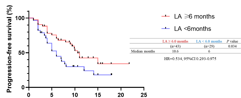 对于既往拉帕替尼治疗获益(疗效评价SD、PR或CR)达6个月及以上的患者,吡咯替尼能够带来更显著的生存获益(10.6个月 vs 6.0个月,HR 0.534,95%CI:0.293~0.975,P=0.034)。
