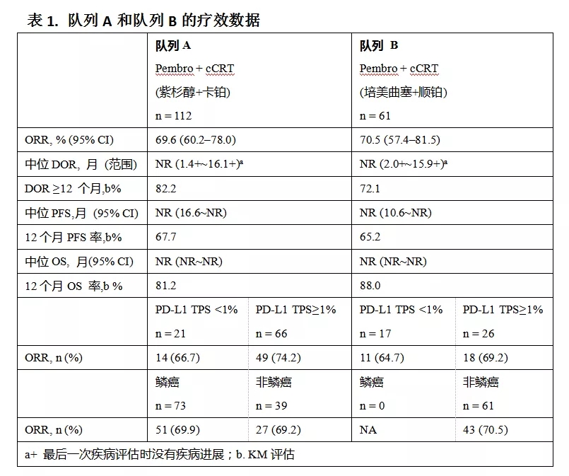 既往报道的中期结果显示,经过≥15周的随访,A组(鳞状/非鳞NSCLC)和B组(非鳞NSCLC)的ORR分别为67.0%和56.6%,≥3级肺炎发生率分别为8.0%和5.5%。2020 WCLC报告了增加6个月随访时长后的数据更新。