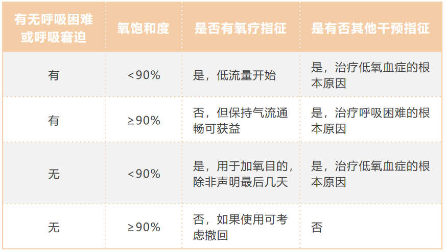 4.2. 对于呼吸困难的低氧血症患者(即室内空气中SpO2≤90%),应提供标准的补充氧气治疗。(类型:基于证据;证据质量:中等;推荐强度:中等)