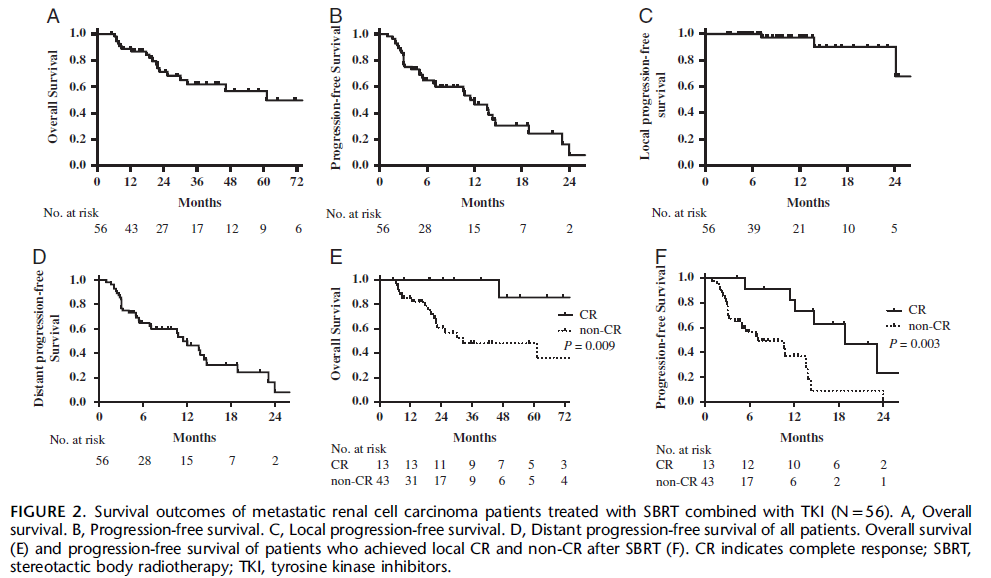 结论:转移性肾癌在TKI治疗基础上联合SBRT治疗安全,并可能改善mRCC生存。TKI耐药前接受放疗的患者有更高的CR率。良好的局控可能会转化为生存受益。