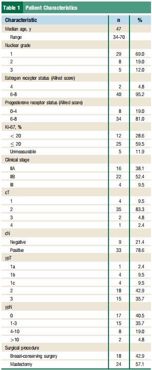 最终对42例患者进行了化疗反应评估(患者特征见表1),42位患者的中位年龄为47岁(范围:34-70岁)。其中16例(38.1%)临床分期为IIA,22例(52.4%)为IIB,4例(9.5%)为III期。42例患者中33例(78.6%)在NAC前为淋巴结阳性。4名患者患有双侧乳腺癌。所有患者均完成了4个周期的TC,绝经前患者术后接受他莫昔芬治疗,绝经后患者接受芳香化酶抑制剂治疗。
