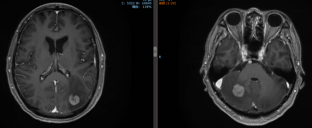 2020年1月患者出现头痛症状,复查脑MR示:枕叶及右侧小脑半球多发结节,结合病史考虑转移灶。