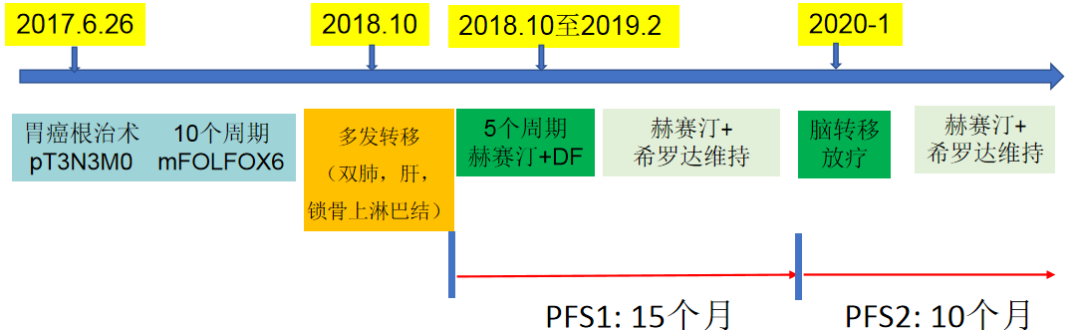 诊断:胃癌术后多发转移(双肺,肝脏,锁骨上淋巴结),Ⅳ期,HER2(+++)。