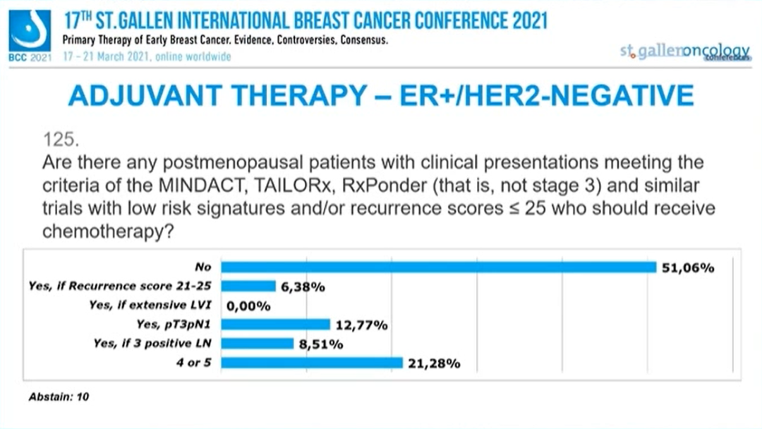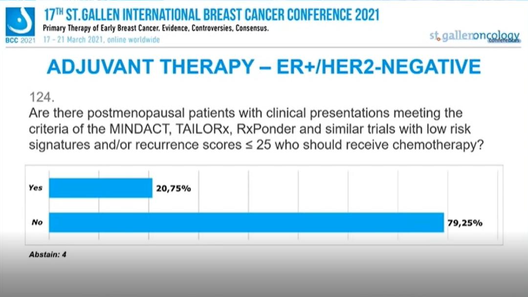 临床表现符合MINDACT、TAlILORx、RxPonder(即不是3期)以及类似试验的低风险和/或RS≤25的绝经后患者,是否应该接受化疗?