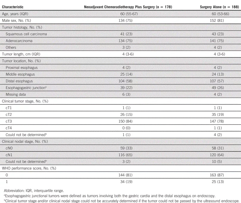2004~2008年,研究人员将366例患者随机分配接受放化疗后手术(n=178)或者单纯手术治疗(n=188)。放化疗方案包括5个周期的卡铂(曲线下面积为2 mg/ml/min)和紫杉醇(50 mg/m2体表面积,第1、8、15、22和29天)加同时放疗(41.4 Gy,23次,每周5天)。纳入的患者平均年龄60岁(男性约78%),以鳞状细胞癌(23%)和腺癌(75%)为主要组织学类型。表1为CROSS试验中意向性治疗人群的基线特征。